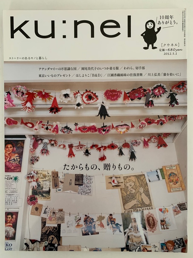 ku:nel / クウネル vol.55 2012.5.1 マガジンハウス たからもの、贈りもの。 アナンダマイーの不思議な国/岡尾美代子のいつか着る服/われら、切手部/東京いいものプレゼント/ほしよりこ「B&D」/江國香織姉妹の往復書簡/ 川上弘美「猫を捨いに」 「ストーリーのあるモノと暮らし」をテーマに渋い誌面作りで文化系女子の心を鷲掴みにした雑誌。 その硬派な特集ゆえにセールスが伸びず、今はオシャレな大人のライフスタイル雑誌という別物にリニューアルされてしまいましたが、今読み返してみても昔のクウネルは優れた雑誌であったことを痛感いたします。 状態: 並 146ページ 27.2X20.7X0.5cm